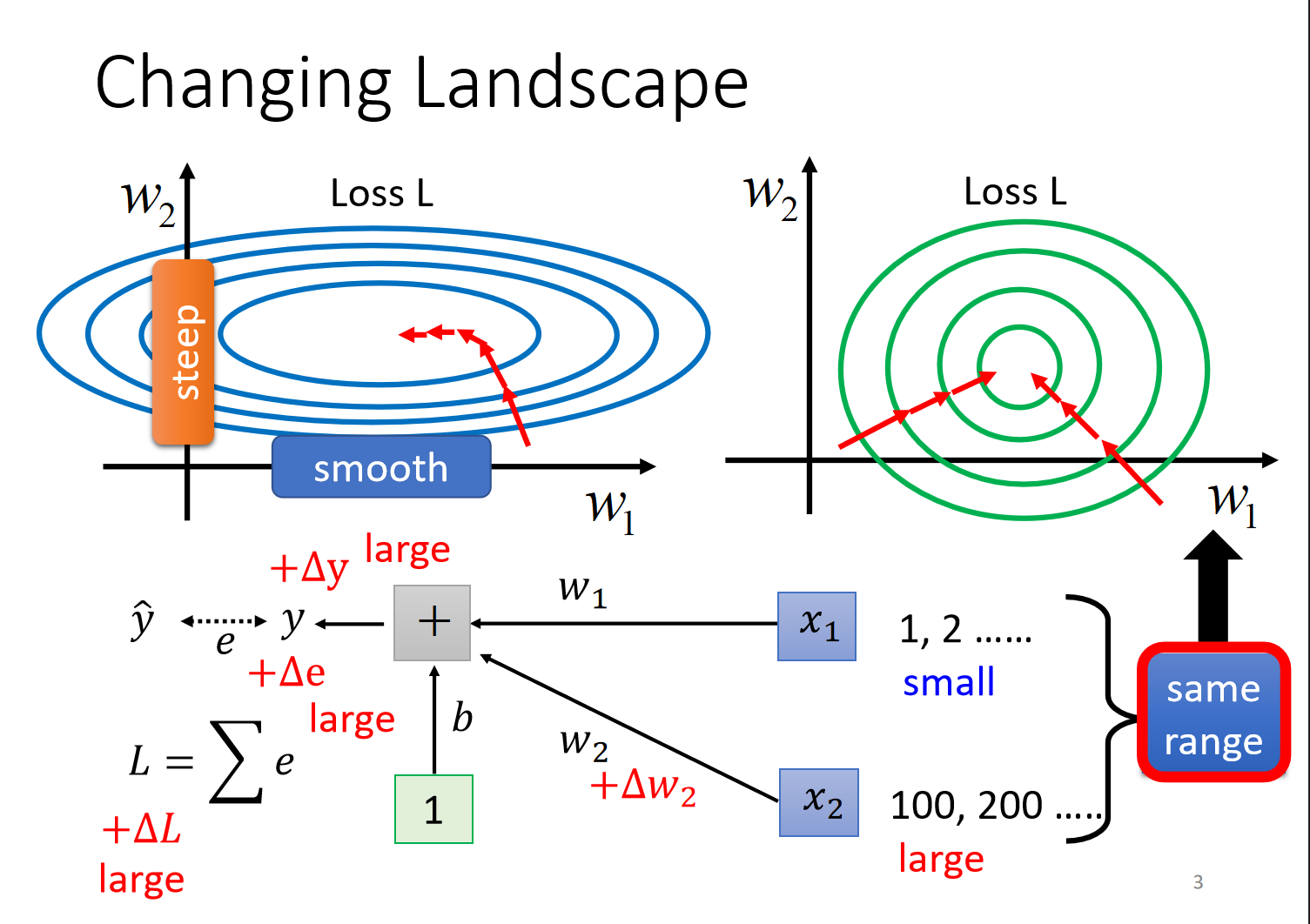 error surface比较崎岖,难以训练、收敛,因此需要将数据归一化