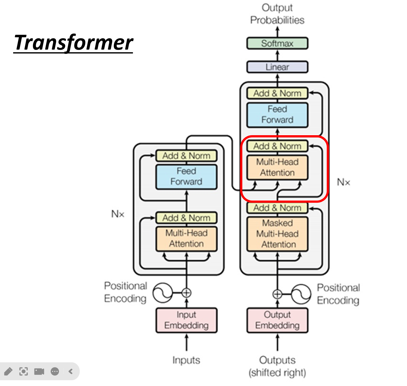 Mask)。这个掩码确保在预测第 i 个词时,模型只能关注到它前面已经生成的 1 到 i-1 个词,而不能“看到”未来的词。这是为了保证解码过程的自回归(Autoregressive)特性。交叉注意力 (Cross-Attention)