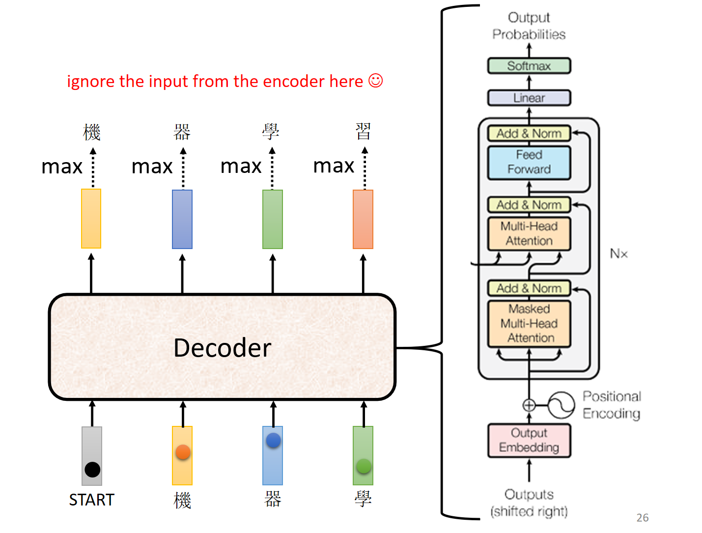 <BEGIN>和编码器的输出,生成第一个词(例如“机”)。 - 将已生成的“机”作为下一步的输入,解码器再生成第二个词(例如“器”)。
