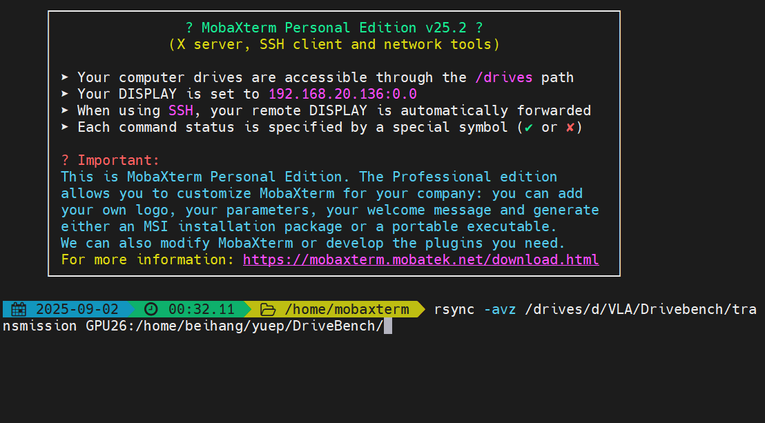 C:\Users\用户名\.ssh\config。但是 MobaXterm 有自己的家: 当打开 MobaXterm 的终端时,进入的是一个独立的 Linux/Unix 环境。这个环境有它自己的家目录 (Home Directory),我的路径是C:\Users\pengg\AppData\Roaming\MobaXterm\home。因此将.ssh中的configcopy过来即可 - 如果ssh配置好了,目标服务器可以直接用别名,比如这里的GPU26