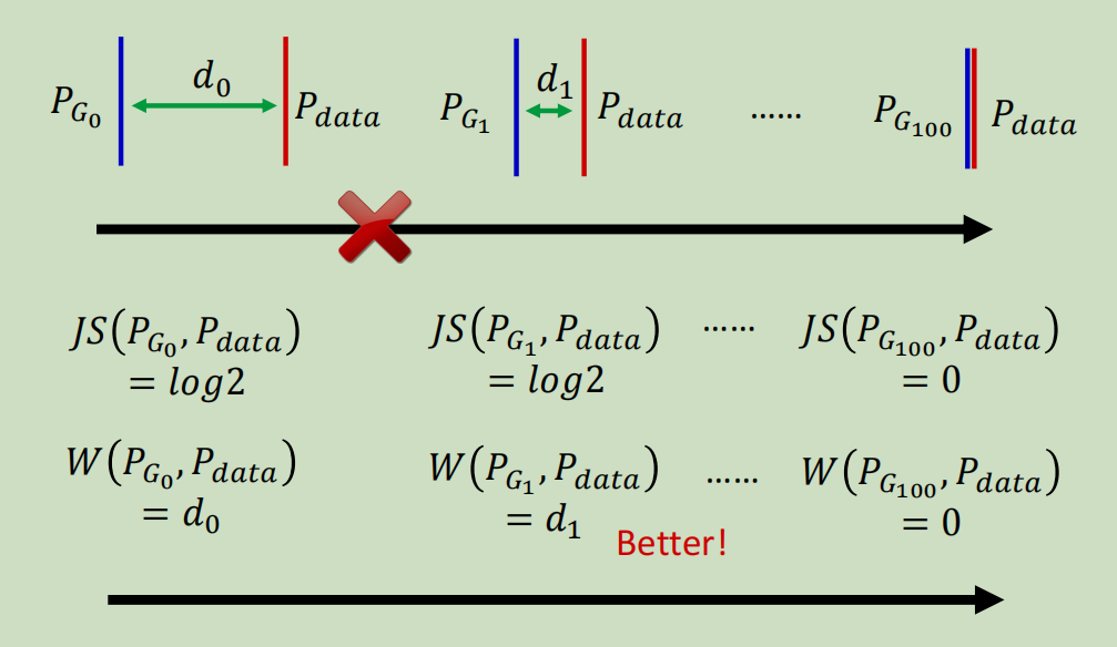 在原始GAN的理论中,判别器D的优化目标(最大化V(G,D))实际上是在计算 PG 和 Pdata 之间的**JS散度 (Jensen-Shannon divergence)**。