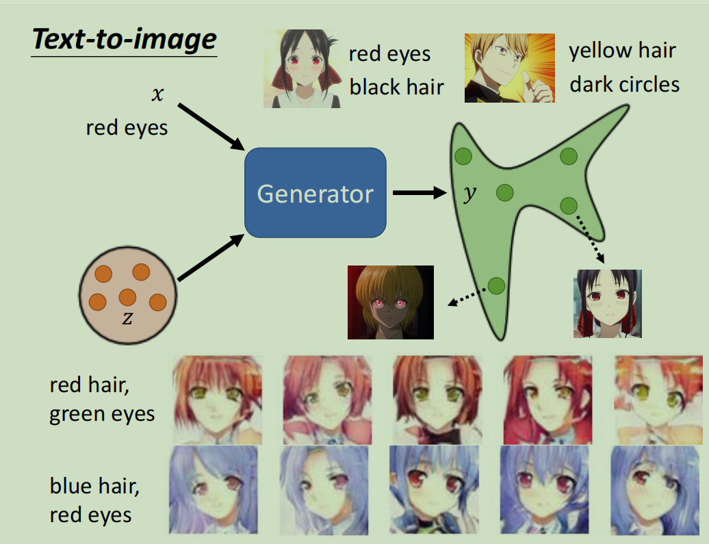 无条件GAN生成的内容是完全随机的,我们无法控制。条件GAN (Conditional GAN, cGAN) 通过引入一个额外的条件输入 x(如文本描述、图像等),来指导生成器生成特定的内容。
