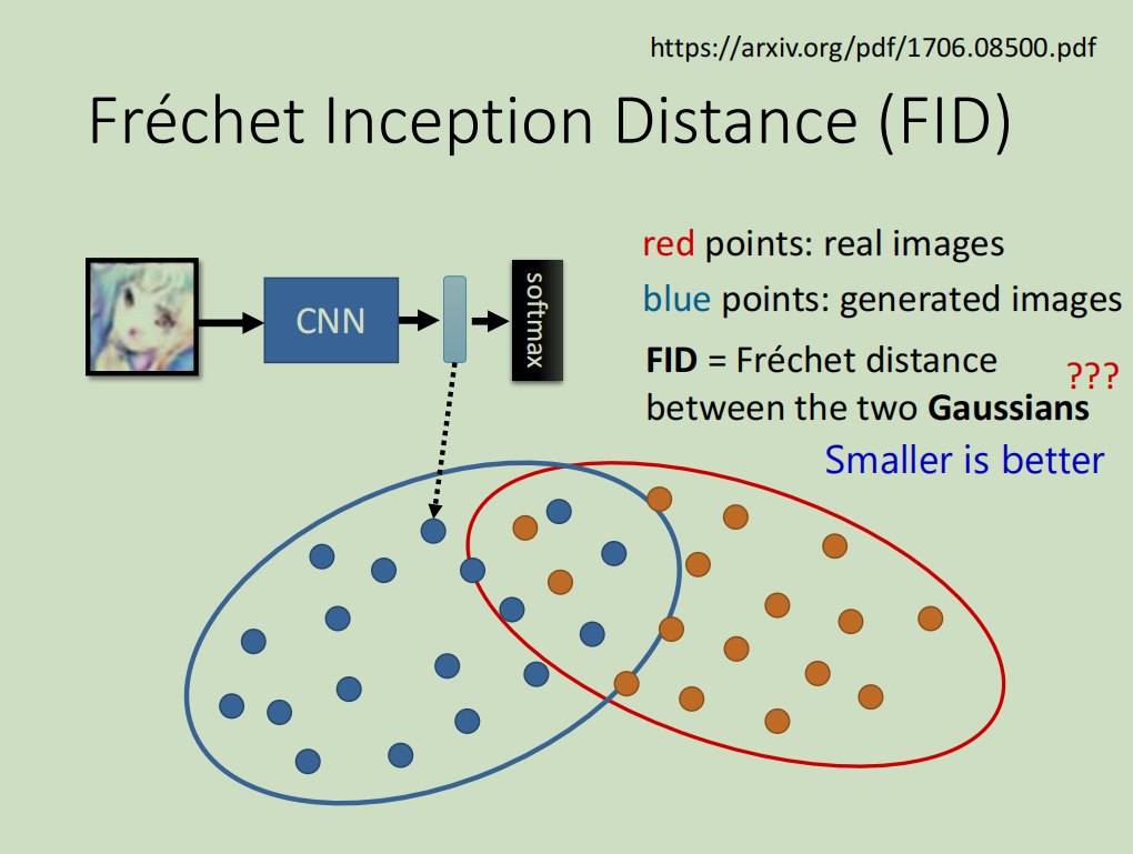 Inception Score (IS): 结合了图像质量和多样性。分数越高越好。但它有缺陷,比如无法检测到是否过拟合了训练数据。
