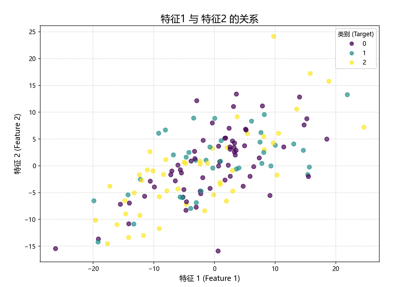 假设我们有两个特征 feature1 和 feature2,以及一个目标类别 target。